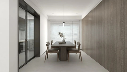 選用【極窄推拉門1606系列】打破密閉空間帶來的閉塞之感,至尊雅致的黑色為環境塑造沉穩基調,安坐其中闊視生活,帶來不凡心境。原木色系整墻與餐桌搭配,協調整個家居的侘寂風格,讓你目光所及,以簡見大。