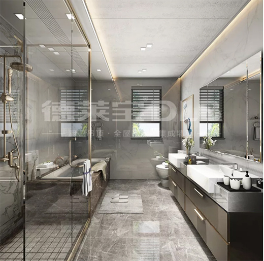 大板吊頂化繁為簡,不攀附華麗的裝飾來表現品位。黑白灰經典的色搭,干凈大氣;邊板的設計,結合簡柔的線形燈點綴,賦予衛生間飽滿的時尚氣質。