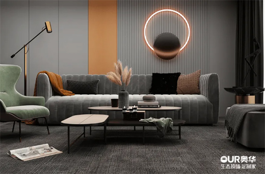奧華貝加爾灰打造的墻面背景,大面積的灰色與棕色相搭配,兩種顏色都是百搭色,因此看起來色調是非常和諧的,也讓冷靜的空間多了一分柔和。貝加爾灰的墻板可以說是非常百搭的一款墻板,但并不意味著室內統一灰色調,善于搭配其他元素,能讓空間更具多元化感受。例如貝加爾灰與奧華香榭麗舍的搭配,典型的高級灰與愛馬仕橙,碰撞出一種輕奢、時尚、高級的韻味。