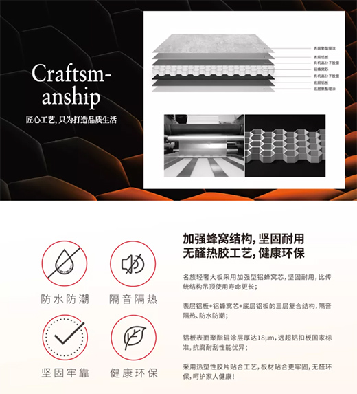 大板采用“表層鋁板+加強型鋁蜂窩芯+底層鋁板”三層復合結構,隔音隔熱、防水防潮、堅固牢靠。無醛熱膠工藝,健康環保,呵護家人健康。