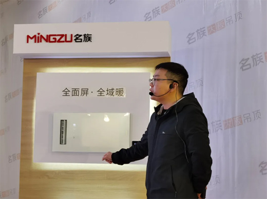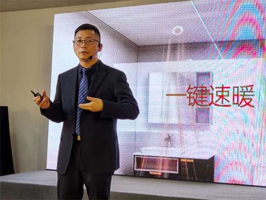 會議繼續,產品市場部總監張曉征先生,對名族2021年春季新品電器和名族大板吊頂進行了全方位的介紹和展示。新理念、新設計、新技術,浴霸電器、大板吊頂產品全新發布,打造讓消費者滿意的高性能高顏值產品。