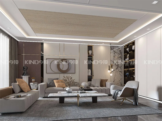 客廳圍形錯(cuò)層設(shè)計(jì)幾乎是每個(gè)客廳的標(biāo)配,無形中使空間更具層次感。石膏白搭配木紋的暖色,配合簡約的金屬線條來融合空間,不僅為家居增添高品質(zhì)感,而且還帶來了意想不到的優(yōu)雅,更在視覺上給人一種精致和奢華的現(xiàn)代體驗(yàn)。