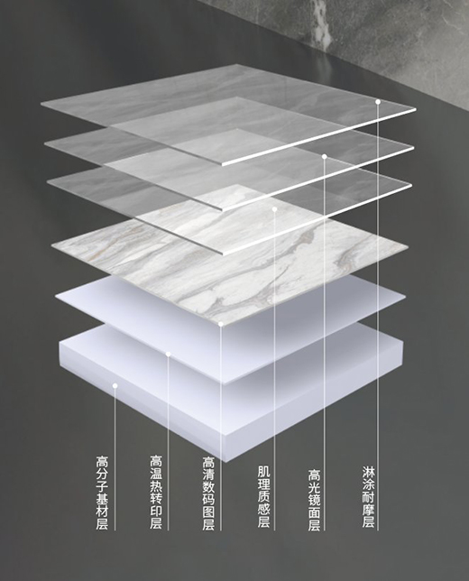 超薄人造石基材,是以天然大理石粉與食品級樹脂,為主要原料,經高溫高壓擠出制作而成。裝飾面層,運用高清數碼打印技術與熱轉印技術實現逼真紋理,再增加保護紋理的釉晶淋涂固化層,更抗刮耐磨。
