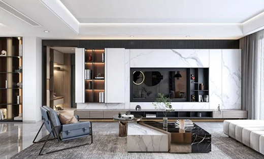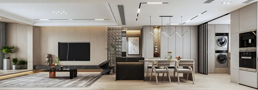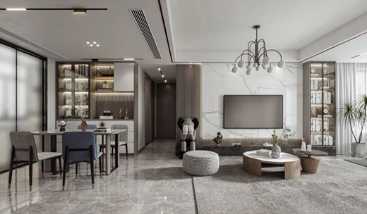 為了更好地呈現(xiàn)出家裝高級(jí)的氛圍感,以點(diǎn)、線、面為切入點(diǎn),構(gòu)成空間體塊,讓板材去引導(dǎo)更多的情緒,形成簡(jiǎn)而不減的動(dòng)態(tài)呈現(xiàn)。