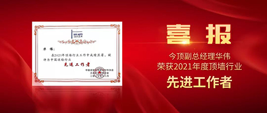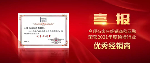 這些榮譽同樣離不開做出貢獻的團隊和個人,在2021年中國頂墻行業年會上,今頂董事長周建成榮獲“2021年度中國頂墻行業風云人物”;今頂副總經理華偉榮獲“2021年度頂墻行業先進工作者”;今頂全國營銷總監吳泉榮獲“2021年度頂墻行業優秀職業經理人”;今頂(運城)門店榮獲“2021年度頂墻行業五星級示范店”;今頂(石家莊)門店穆亞鵬榮獲“2021年度頂墻行業優秀經銷商”。