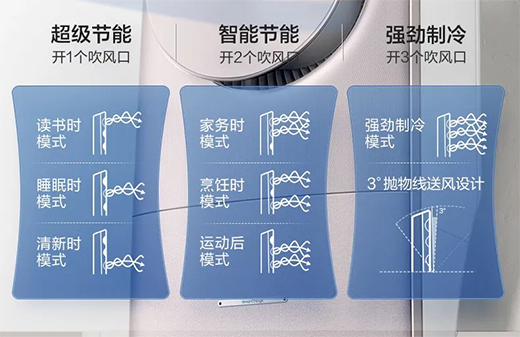 High Pass直通式送風,從后吸入空氣后馬上送出快速直接,同時采用飛機噴氣發動機氣流控制方式,噴出的氣流呈3°拋物線軌跡,出風范圍廣,配合旋轉風扇快速冷卻房間,調溫效果好。面板有微孔排布,舒適之風,溫柔制冷。