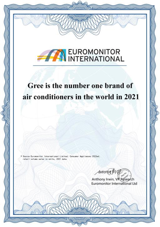 (圖為“格力家用空調(diào)2021年品牌零售銷(xiāo)量居全球第一”認(rèn)證)