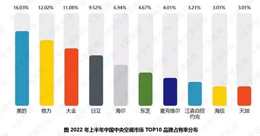 《中央空調(diào)市場》發(fā)布的數(shù)據(jù)顯示,2022年上半年,美的以16.03%的市場占有率位居行業(yè)首位,在離心機、螺桿機、模塊機組等冷水機產(chǎn)品中,美的市場占比均保持國產(chǎn)品牌領(lǐng)先。從跟隨者到領(lǐng)導者,從技術(shù)引進到技術(shù)創(chuàng)新,美的不斷刷新著中央空調(diào)行業(yè)的“高度”,引領(lǐng)“中國智造”的發(fā)展。