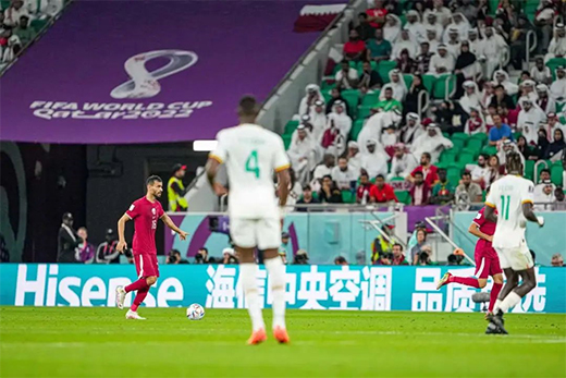 11月25日,北京時(shí)間21:00,在萬眾期待中,世界杯小組賽第二輪A組首戰(zhàn),東道主卡塔爾對(duì)陣塞內(nèi)加爾的比賽正式打響,最終塞內(nèi)加爾憑借流暢的進(jìn)攻將比分鎖定在3:1。在歡呼的海洋中,“Hisense 海信中央空調(diào) 品質(zhì)首選”醒目的中文廣告牌成為賽場一道不容忽視的靚麗風(fēng)景線。