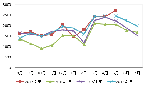 產業在線:2014-2017冷年空調電機內銷走勢(萬臺)