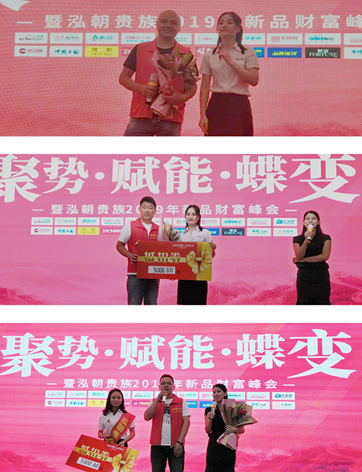 隨后,在全場泓朝家人們的見證下,泓朝總部在此兌現(xiàn)承諾——經(jīng)銷商年終返利,惠州羅總、衡陽彭總以及海口吳總?cè)粯I(yè)績優(yōu)秀的經(jīng)銷商如期所愿。全場響起掌聲,既是給予成功者的贊揚,也是對自己的鼓舞。