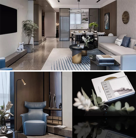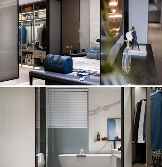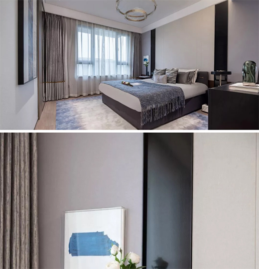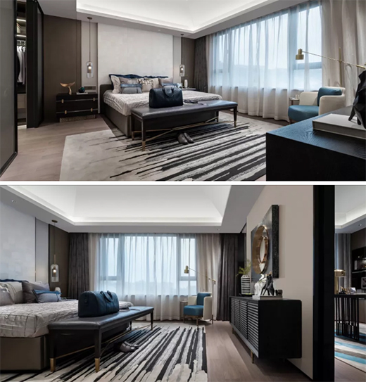 主臥室沉穩的色調點綴古銅鑲嵌,呈現出高品質生活的氣息。兼顧實用和舒適性的質感家居,淡雅的藍色搭配,塑造了別樣的居住美感。