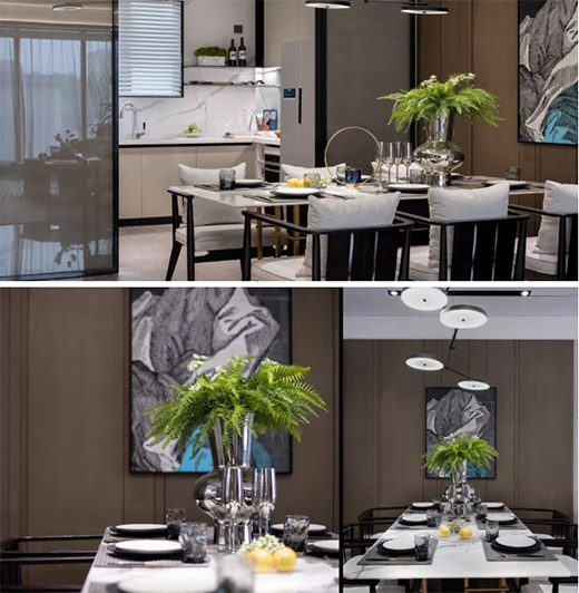 設計創造了空間,空間反哺于人,餐廳區通過兩扇玻璃門將光線引入室內,同時也將儀式感端上餐桌,營造舒適的用餐氣氛,舒暢人的心靈。