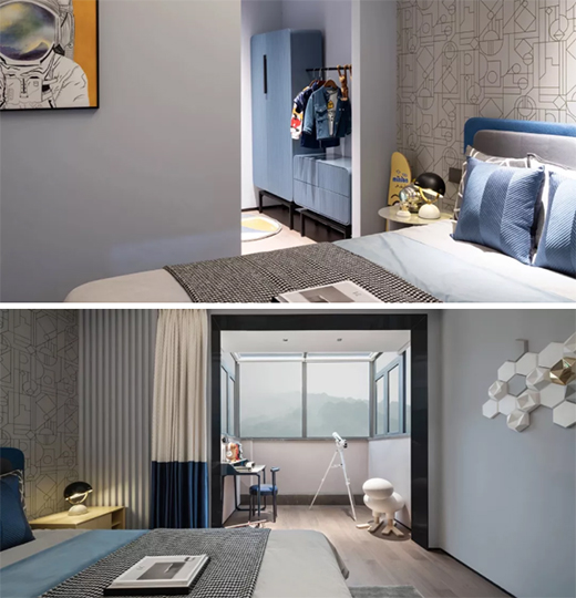 男孩房的色彩跳脫于整體空間的灰藍,采用充滿活力的天空和動感作為跳色,通過豐富的飾品。