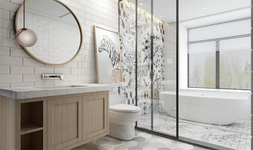 衛生間使用多功能鏡柜設計,邊角線條保留了古典風的優雅別致,多用方正造型營造了強烈線條感,讓整體空間更顯潔凈開朗。