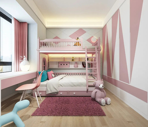 將粉色少女心滿滿地鋪進在房間里,使它擁有沁人心脾的糖果色的清新感,同時采用現代簡約質感的雅致家具,給居住的少女賦予非常輕松的空間情境。