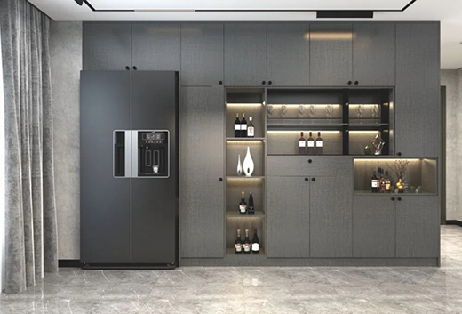 柜門板優雅寧靜中搭配中性灰?調,勾勒出成功品位的?活態度,讓??見難忘。五?拉?配件做?精細小巧,使您低調?不刻意的雅致品位?然隨意。獨特創意的柔和吊燈,讓您的家更顯品位。