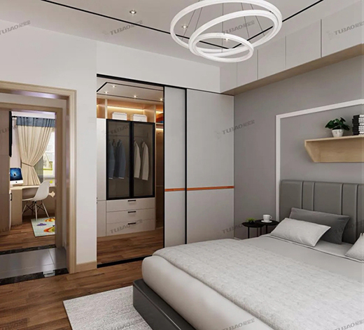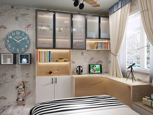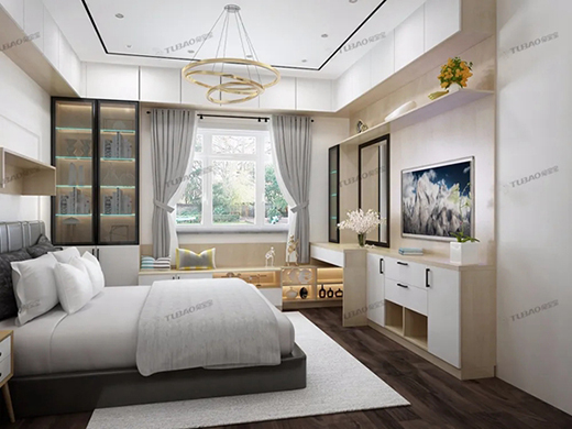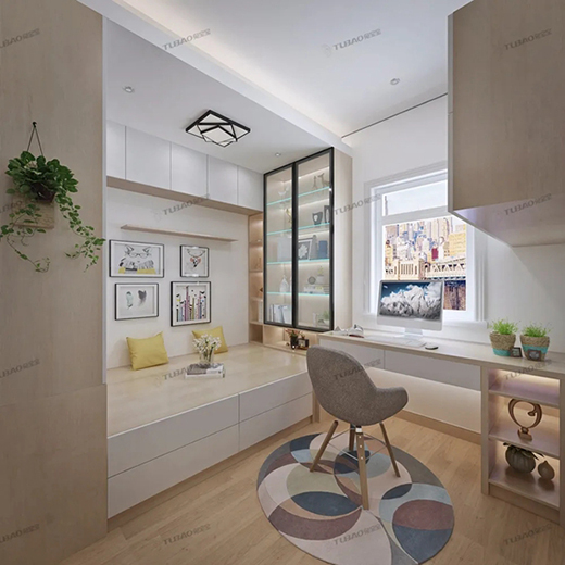 通過以下效果圖可以看出,兔寶寶全屋定制將臥室收納做到了極致,頂部做成環繞式收納柜,還有窗臺榻榻米、書桌柜、梳妝柜。這樣的臥室可以裝下四季了吧~兔寶寶全屋定制有一個很大的特點:環保。所以選擇兔寶寶就少了很多裝修污染的煩惱,尤其是對于收納提出高要求的業主朋友。
