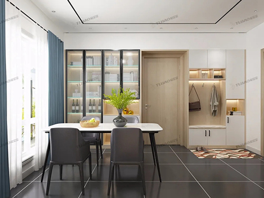 對于小戶型房子,餐廳不易做成獨立空間,因為這樣會造成空間大浪費還會成壓抑感,所以小戶型餐廳做成開放式是非常明智的選擇。以上定制方案適合大多數家庭,餐廳區域定制餐邊柜,業主可以隨時取放珍藏的紅酒,享受生活的片刻愜意。而做成了玻璃柜門,盡顯通透感,起到擴容效果。