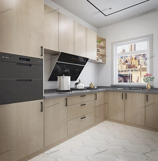 夢境系列定制櫥柜以木色為,整體感強,讓人舒服。抽屜式收納、格子式收納、柜門式收納將廚房打理得井井有條。讓下廚so easy,燒菜更享受。