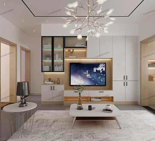 這款定制電視柜收納功能同樣十分強大,白色+木色和諧統一,完美銜接,玻璃柜門的插入使整個空間靈動了起來。