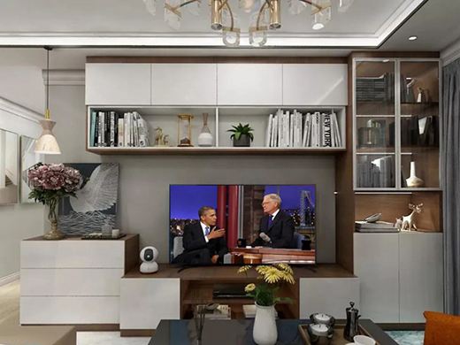 ▲電視柜布置簡約卻不簡單。上翻門吊柜、儲物格、玻璃門儲物柜、地柜、抽屜等,圍合成一個愜意的觀影區,可供收納和裝飾。
