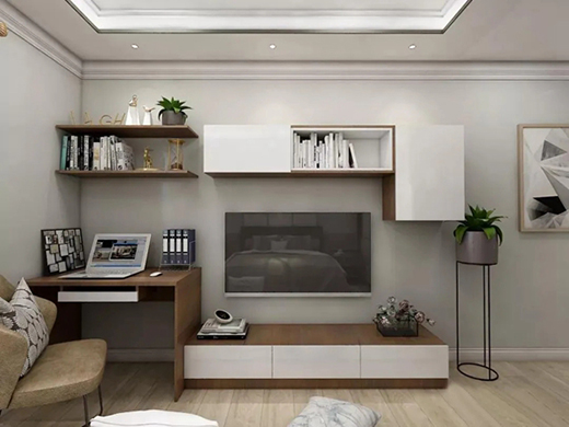 ▲床尾電視柜與書桌構成觀影區和辦公區,充分利用墻面和墻角,美化空間的同時,增強儲物力。