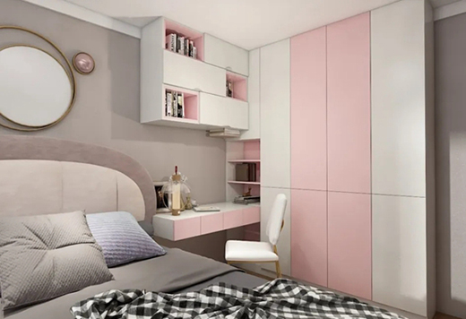 ▲櫻花粉體現女孩房特有的色調,衣柜由掩門柜與儲物格組合而成,滿足孩子學習、收耐多方面的需求。