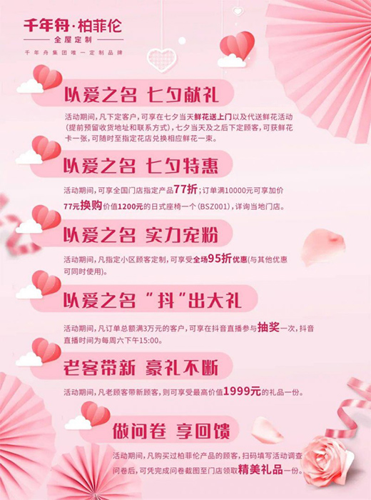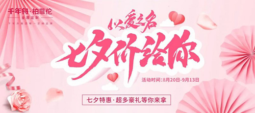 農(nóng)歷七月初七是中國傳統(tǒng)情人節(jié),感謝您一直以來對(duì)千年舟·柏菲倫全屋定制的支持與喜愛,特于2020年8月20日—2020年9月13日,在全國千年舟·柏菲倫全屋定制指定活動(dòng)門店舉辦此次“以愛之名,七夕‘價(jià)’給你”活動(dòng)。