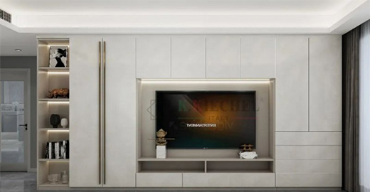 輕奢門板搭配拉絲亞金拉手,面與線的交織,空間架構純粹,客廳柜各功能之間相互結合,加深整個空間細節體驗,延伸視覺空間。