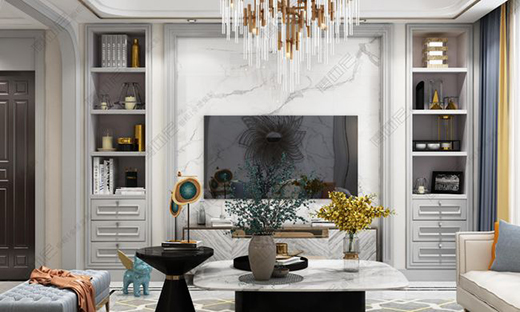 對稱在設計中的廣泛運用不無道理,極具美感,對稱式電視邊柜,開放格與抽屜的結合讓收納功能更加豐富。電視嵌入式設計節省空間,大理石花紋背景墻迎合空間色調的基礎上,給家居生活增添了一些自然氣息。貝加爾灰門板搭配金屬拉手,提升空間質感,模壓門型造型美觀雅致。