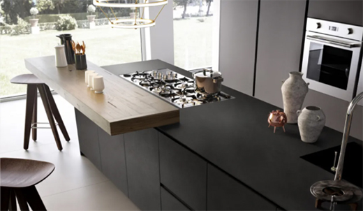 相比黑色的神秘,灰色更顯柔和平靜。無論跟何種色系搭配,都能有色彩碰撞的視覺效果產生,讓空間更加出彩。巖板表面不規則分布的白色細紋,看似單調,實則豐富,讓整體更加立體飽滿。