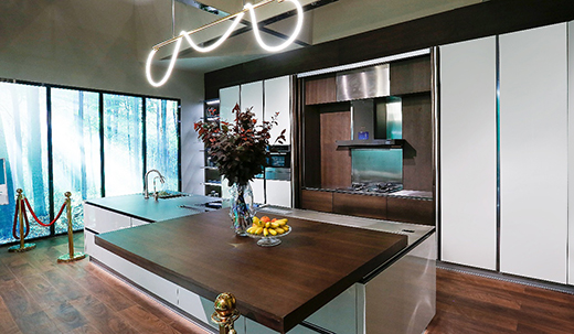 而“拉菲諾3”系列定制櫥柜則是以亮光烤漆搭配煙熏木色,沉穩大氣,科學規劃了L型轉角櫥柜+中島的動線布局,將中廚功能和西廚設計進行了完美結合,既能滿足國人的煎炒習慣,又能滿足西餐愛好者的烹飪需求。