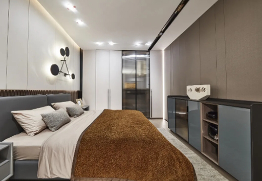 臥室利用超高門衣柜拉升視覺,采用異色封邊工藝的橫濱白雙飾板,科技橫紋層層交疊,肌理感與立體感十足,強烈的線條感凸顯出極簡美,整體柜身輕薄而穩定。衣柜的灰白色調營造出舒適輕盈之感,搭配紋路細膩的磨砂玻璃,新奇而質樸,朦朧而寫意。素雅恬淡、具有超薄框架結構的斗柜,增加了空間的層次感,更方便收納使用頻率較高的物品。整個空間搭配隨意而時尚的燈具,恬淡的生活氣息自然流露。