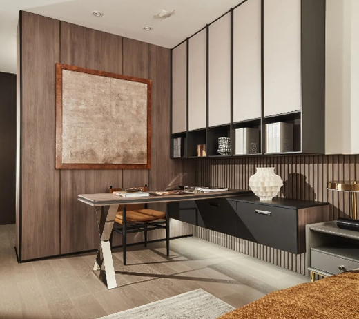 兼具收納、裝飾功能的書柜,利用開放格與封閉柜組合,增強了書房的層次感,為讀書時營造出靜謐的氛圍,造型簡約的書桌與收納柜連接成一體,表現出空間獨特的美感,可謂匠心獨運。簡約的復古地毯與書桌后的木紋背板相互呼應,把古典和雅致融合統一。