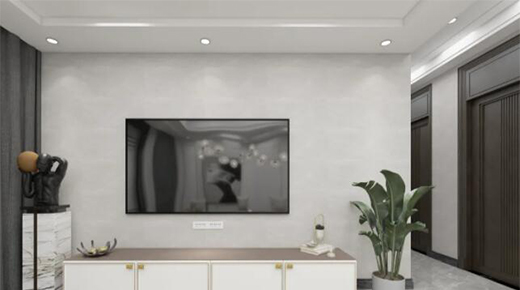 一字型的電視柜,淺棕色木紋柜身,金線纏繞在白色門板上,搭配金色菱形拉手,顯得精致萬分。不需要太多,簡單的兩盆綠植搭配電視柜,就是最好的背景。