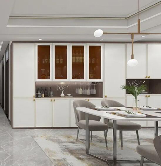 一米多高的連綿玄關鞋柜挨著餐邊柜酒柜,將所有物件藏在柜子里也未嘗不是最好的收納。