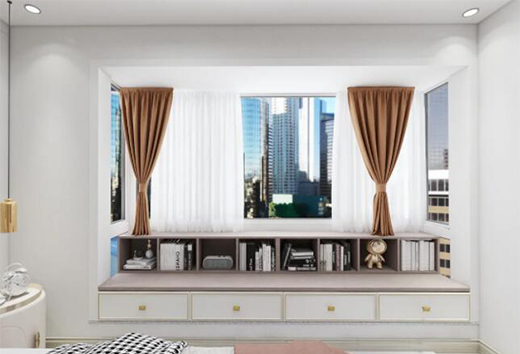 飄窗直接做成了個休閑用的榻榻米,還有個小小的書柜,供主人享受午后愜意時光。