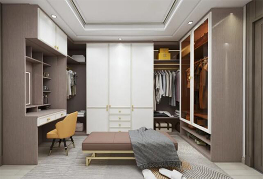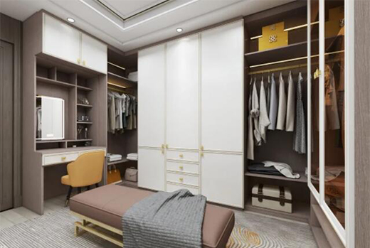 就著房間戶型,設計師將衣柜收納和梳妝區域結合,專門開辟出了步入式衣帽間,掩門、玻璃門、開放式空間科學布局。
