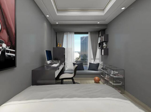 從柔軟的大床上看過去,書桌和小書柜加上飄窗榻榻米,正好適合學習和休閑用。