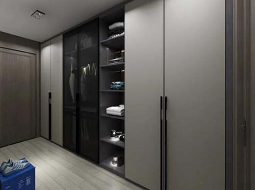 高級灰色板大衣柜,黑色玻璃掩門隱藏著朦朧的波浪紋,搭配皮質長拉手更是給人一種硬漢子式的朝氣。