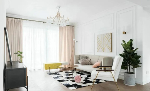 輕裝修重裝飾,小資歐風靠軟裝搭配出美感,有黑白灰的高冷感,又有綠植、布藝沙發、實木家具、清新自然的裝飾畫以及柔軟的地毯帶來的溫軟和活力??臻g整體傾向于淺色系,給人一種干凈明朗的感覺。