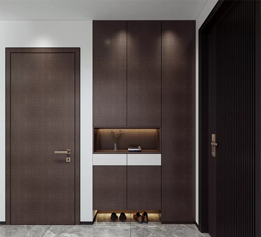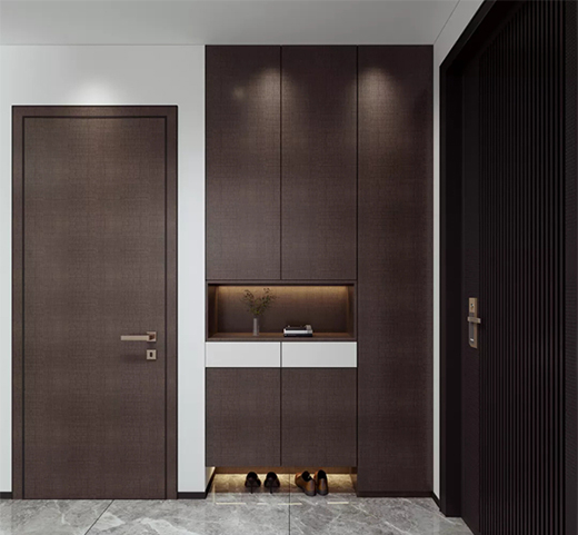 貝倫灰橡花色,紋理細膩柔和,高冷且溫馨,鞋柜置頂設計,空間往上拓展,不占空間,中間鏤空設計,讓鑰匙包包之類的隨身物品有了存放之處,暗藏LED燈帶,晚上回家看到還有燈為自己亮起,更有安全感。
