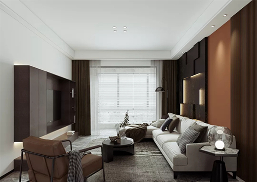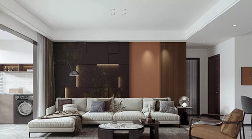 輕奢工業常以黑、白、灰等冷色系為主,加入1-2種暖色調家具,如布料米色沙發、橘色休閑椅,增加空間溫度,銹蝕鋼板做背景墻,與墻面的橘色相呼應,為空間創造微溫馨俏皮的視覺效果。