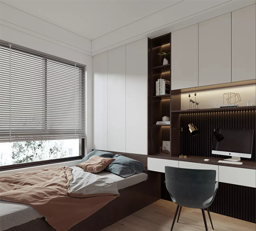 阿爾卑斯白的置頂衣柜,電視柜、梳妝臺一體化的設計,滿足多樣的收納需求,收納力MAX,擴大人在臥室自由活動的區域。棕色格柵背景墻,略帶金屬小細節,簡而不失其華,奢不顯其澀,回歸最根本的居住本質。