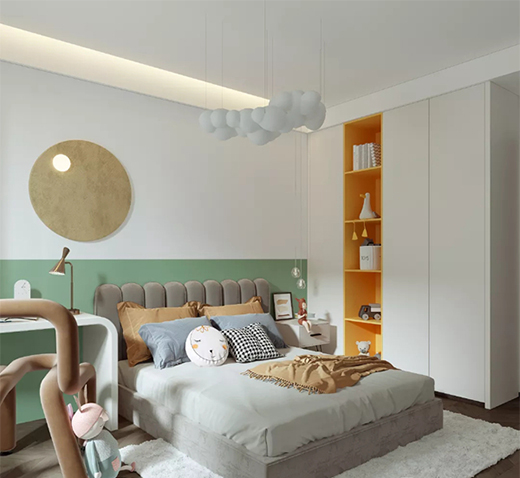采用白色為主基調,阿爾卑斯白的置頂衣柜,通過棕、橘等跳色增強視覺效果,書柜與學習桌結合,加以燈光營造的視覺效果,給孩子更多的趣味和想象。