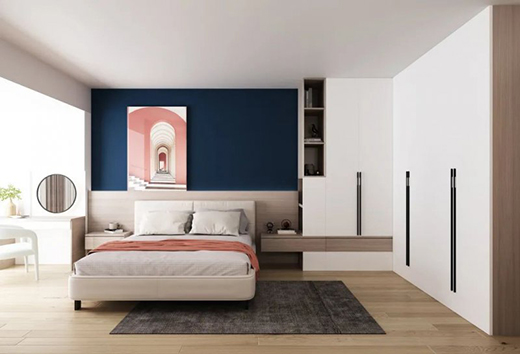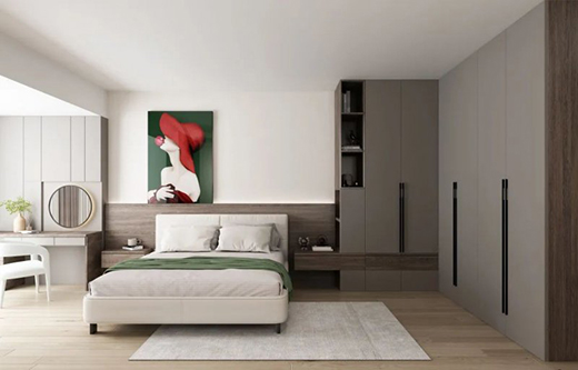 一字型加梳妝臺設計,背景格柵成為整租柜體的點睛之筆,上下分節設計和右側梳妝臺左右呼應,內部加下拉式掛衣桿方便使用,整體風格給人感覺簡潔、自然、人性化,白色和木紋色讓人感覺干凈舒適。