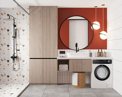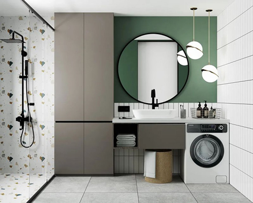色彩分明的衛生間的大膽撞色給北歐風格讓人心情舒暢。橙色象征璀璨的陽光,它的明亮可以振奮精神,使人充滿活力,一掃空間的寒冷及沉悶感;綠色的深沉,優雅而獨樹一幟,有著歲月沉淀的內斂,直抵我們內心深處的安寧。左側高柜可收納日常用品,開放加抽屜設計滿足平時小需求,整體麻雀雖小但五臟俱全。