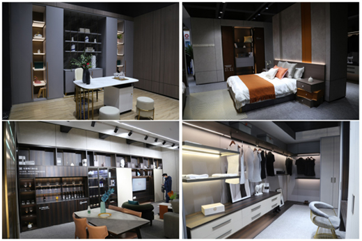 在展館內部,展示了簡鉆旗下的“輕奢至臻”系列,采用進口板式與當今潮流色互相搭配,釋放詩意與浪漫的空間。柜體運用結構感強烈的墻面設計,凸顯極簡美感,探尋無拘束生活潛能。