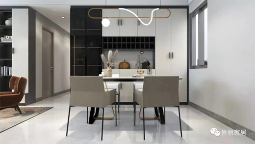 清雅而舒適的生活,也可以不失品味與溫度。魯麗家居設計師采用黑白色系的撞擊跳出傳統設計的條條框框,輔之以少量金屬裝飾,為餐廳增添更多溫度,讓空間更顯精致。